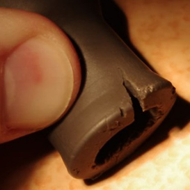 Показателем к замене наконечников катушек зажигания является характерный коричневатый цвет самого материала, возможные трещины/микротрещины на поверхности изолятора (наконечника). На фото ниже представлен пример отслужившего свой срок наконечника автомобиля Toyota одного из наших сотрудников.